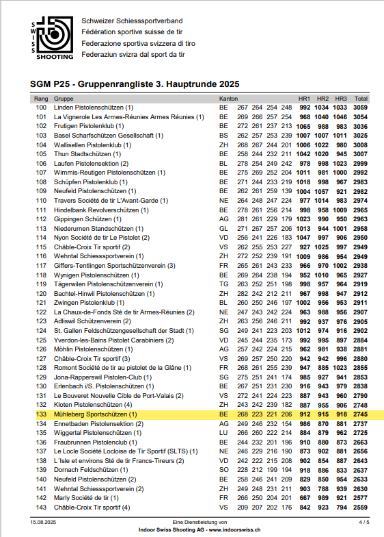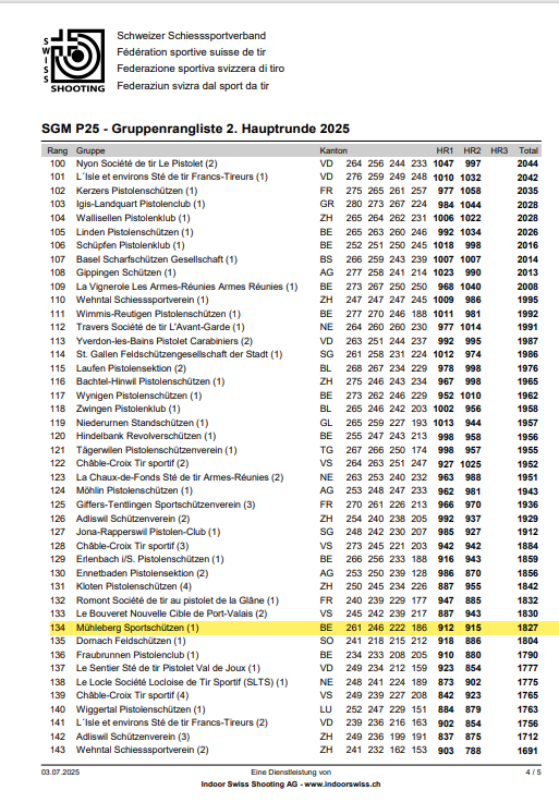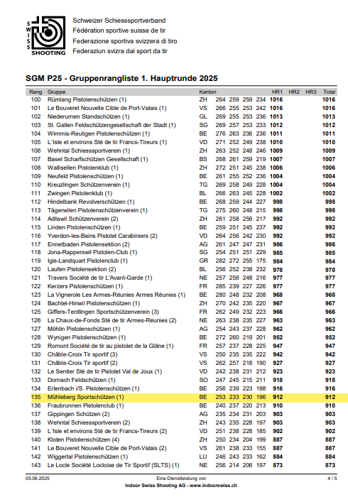 Seit ich bei den Pistolenschützen Mühleberg trainiere, erlebe ich das erste Mal das wir eine Gruppe aufstellen können für die Gruppenmeisterschaft. Wir konnten uns auf dem 135Platz mit 902Pkt. platzieren und können somit in die Hauptrunden einziehen.